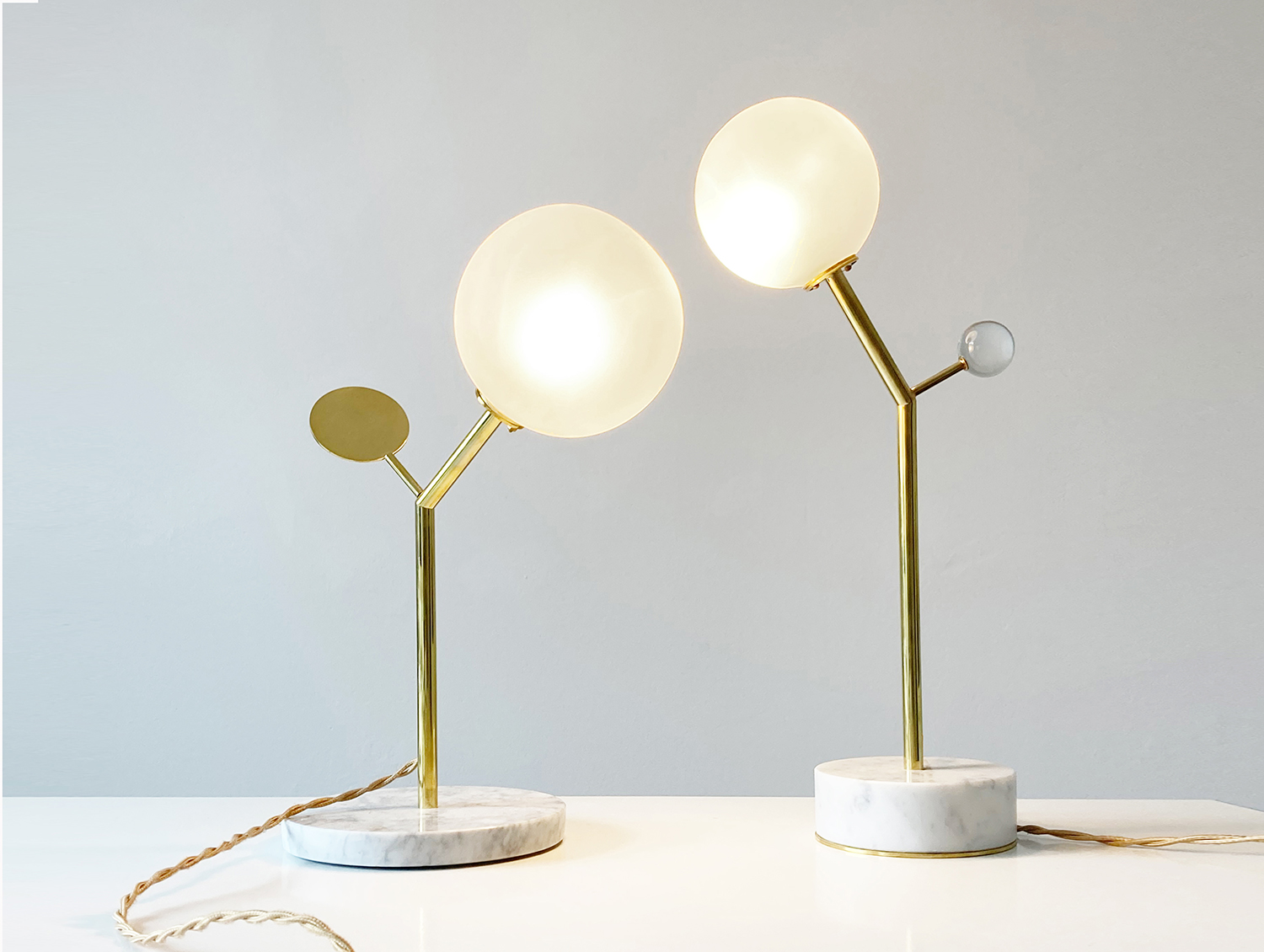 twig table lamp in marble, polished brass and sandblasted glass globe