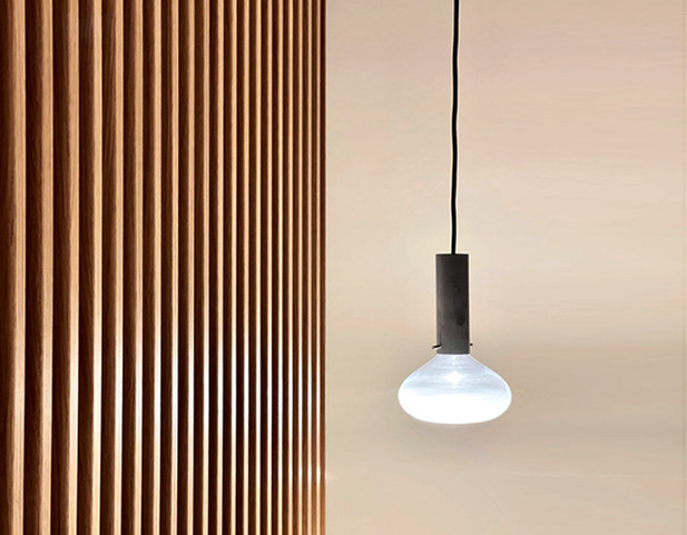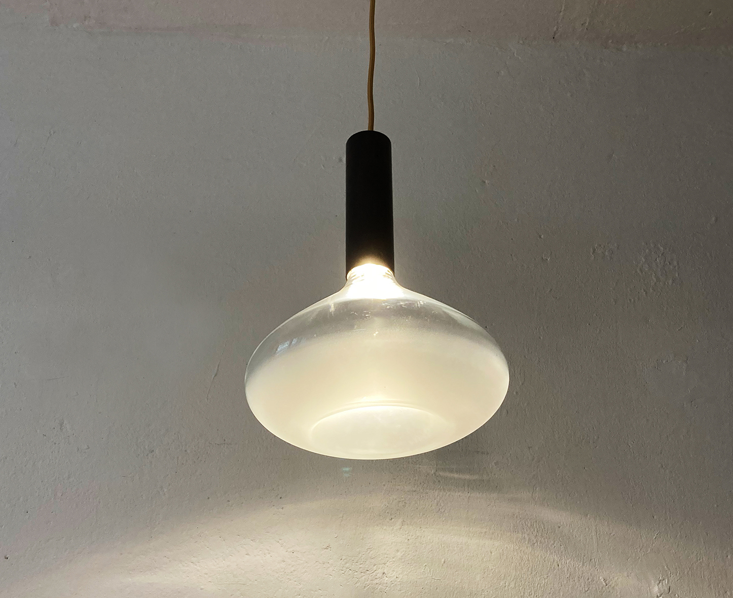 pendelleuchte aus mundgeblasenem glas und metallrohr mit versteckter lichtquelle. das licht trifft auf eine gesandstrahlte fläche und leuchtet so blendfrei. der glaskörper ist nach unten geschlossen und nach innen gedrückt. zusätzlich ist der untere teil wolkig gesandstrahlt.