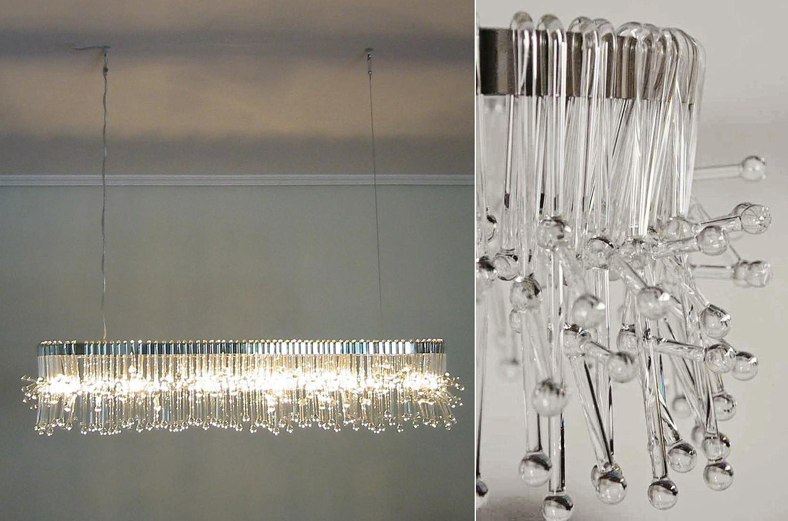 pendelleuchte aus ovalem umlaufenden metallband über dem 184 frei geformte glashaken hängen, die aus der mitte heraus beleuchtet werden. die leuchte wird seit 2010 von der firma mawa design produziert und vertrieben.